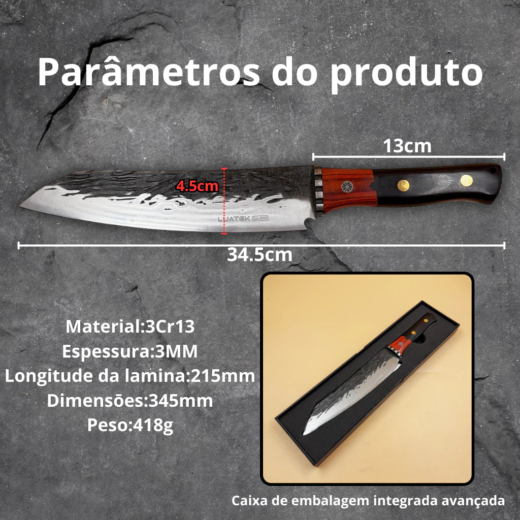 A Faca Chef Artesanal Full Tang 34,5cm foi desenvolvida para quem busca precisão, resistência e alto desempenho na cozinha. Produzida em aço inox 3Cr13, ela oferece excelente poder de corte, boa retenção de fio e resistência à corrosão, ideal para uso frequente no dia a dia.
