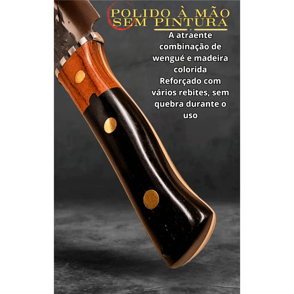 O cabo em madeira natural, com montagem full tang (lâmina inteiriça), proporciona equilíbrio perfeito, pegada firme e conforto mesmo em usos prolongados, além de um visual sofisticado e artesanal.